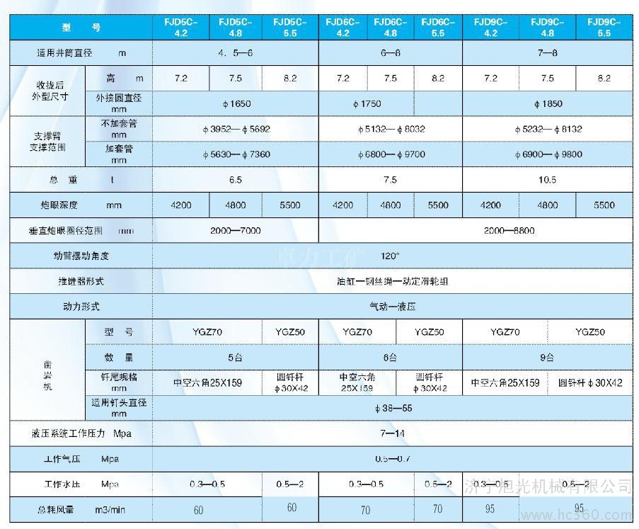 3、 工作范圍大,FJD傘形鉆機適用于從4.5米至8米的小、中型井筒。大至8米以上的井筒均能施工。