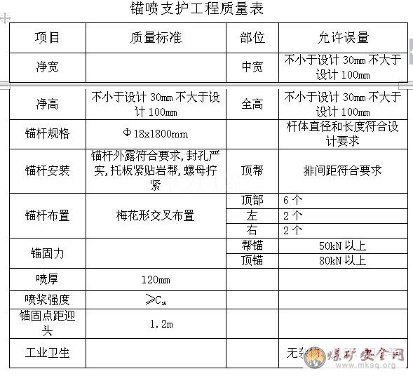 噴漿時在井下設置料場及噴漿站,通過輸料管輸至工作面,噴漿時采用D2-5型噴漿機一臺輸料管采用直徑76毫米焊管,噴時厚度為120毫米拌料配合比水泥:砂:石子為1:2:2.8(重量比)水泥采用DO32.5Q普通硅酸鹽水泥,砂子為中粗砂石子粒徑為5毫米,水灰比控制在0.45,速凝劑摻量為水泥用量的3-5%,噴漿時開機必須先開水后開風,再送電,最后上料。停機時要先停料,后停電,再關風,最后停水。每天必須首先對當天的祼巖進行封閉初噴,一般初噴厚度不小于30-50毫米保證工作面錨桿不失效,噴漿手噴漿時,噴頭出口距噴漿面距離控制在1-1.5米之內,以減少回彈,噴頭以螺旋式軌跡轉動,拌合料要隨拌隨用,砼料在地面料場由人工拌合,下至井下噴漿機處,砼料存放時間不超過24小時(不摻速凝劑),拌合料噴漿完后,要清理干凈噴漿機周圍。