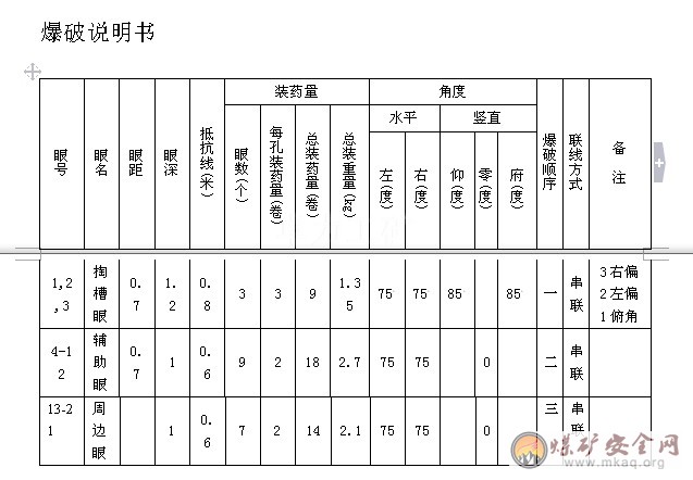 3、裝藥放炮:裝藥放炮工按作業規程規定爆破參數進行裝藥檢查,放炮時先放掏槽眼,其次輔助眼,再而周邊眼,巷道成形規整,不得出現超挖欠挖現象。