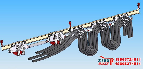 和水管沿著巷道吊掛和移動。該裝置避免了井下電纜凌亂擺放,減少了電纜的占用空間與電纜的移動次數,避免了人工
