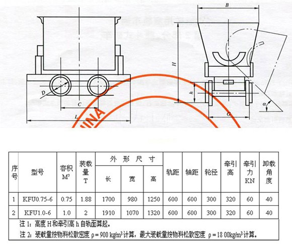 翻斗式礦車(chē)型號(hào)表示含義: 例:KFU0.75-6翻斗式礦車(chē)