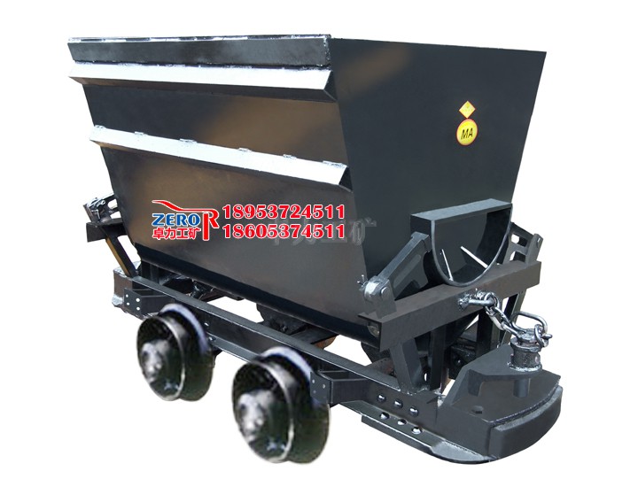 翻斗式礦車組成:它是由車箱、車架、緩沖碰頭、輪軸等組成。特點是結構簡單,堅固耐用、使用方便、只要人力打開止動版就能很容易地卸下物料。